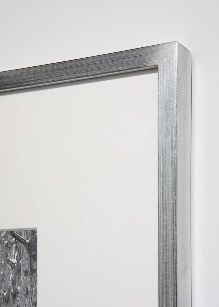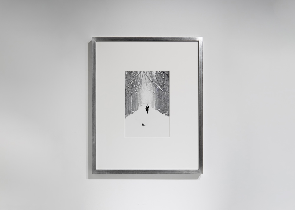 今回は木製の額縁に銀箔を使用し、光沢を持たせることで作家ならではの印画紙のハイライトを活かす額装を行いました。そこにヘアライン加工(色のあるフレームの上に箔をのせ、ブラシで撫でることで非常に細いラインを入れることができる加工方法)を施しました。フレームの地の黒色が細く線として出ることで、上品で格式高い印象を与えます。マットは少しウォーム(暖色)なベンブリッジ社のミュージアムボードの使用しています。