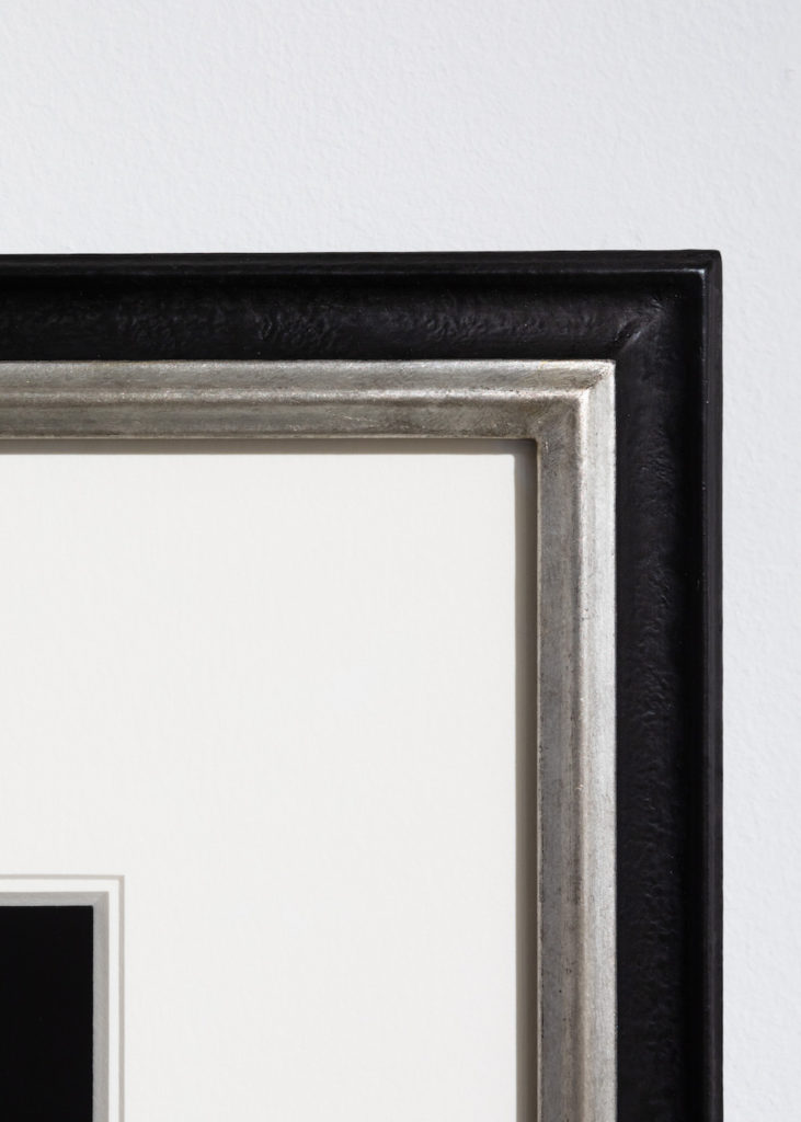 額縁は外流れタイプのフレームを採用しました。見え幅(額を正面から見た時に見える額の幅)は写真作品に最適な30mm。額縁の内側のみ箔押しで華やかに仕上げ、外側のなだらかなスロープ部分は少し凹凸をつけた表情のある黒塗装になっています。木材の削り出しから始まり、1から加工を行う本縁だからこそ、細かなこだわりも再現することが出来ました。