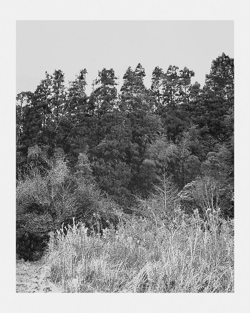 人工林の写真を切り取ってコピーを繰り返し、テクスチャを変更すると、人の姿も鳥の姿も見えなくなる。森の原形は、夕暮れの窓硝子に映った反射像のように僅かに感じられる。