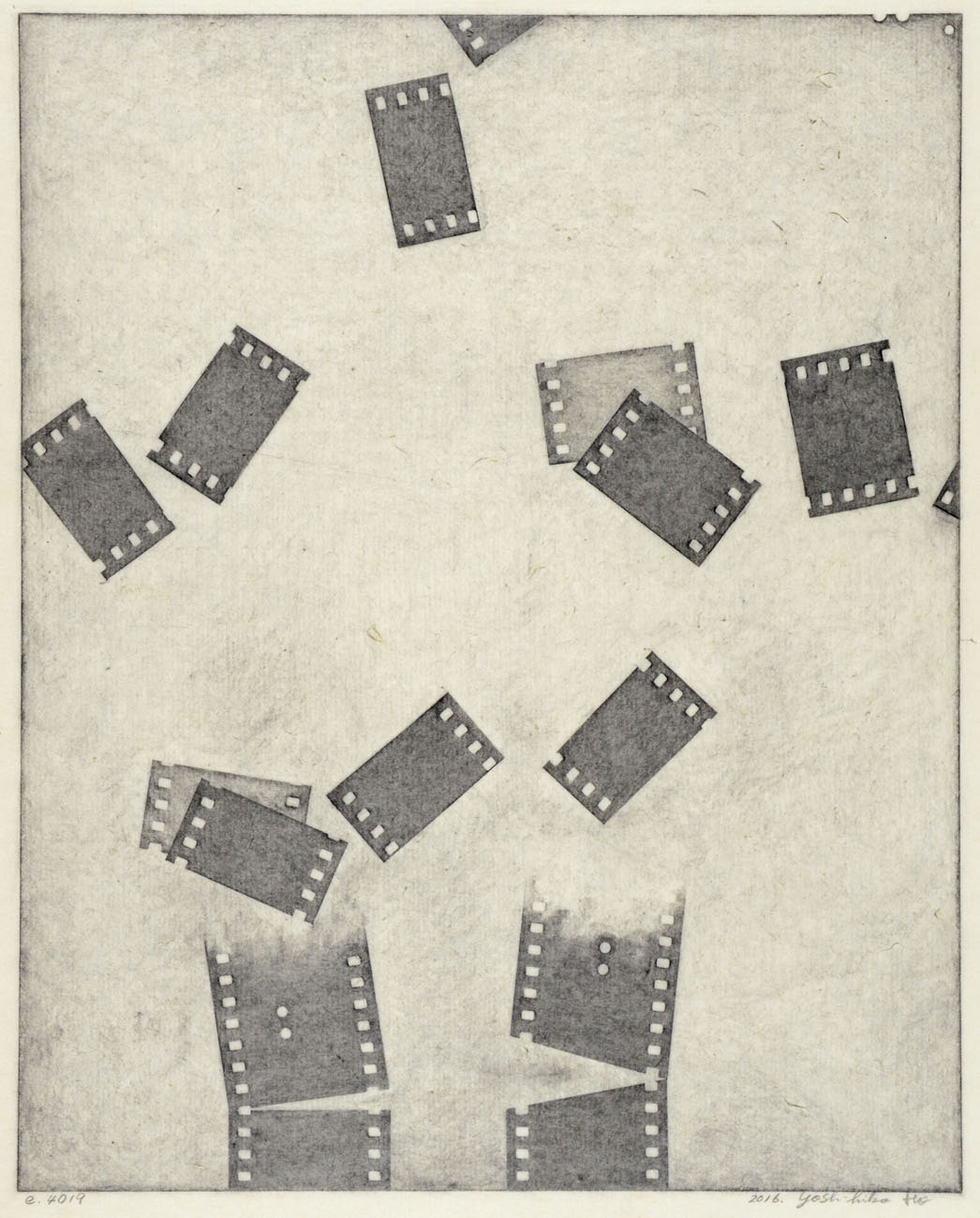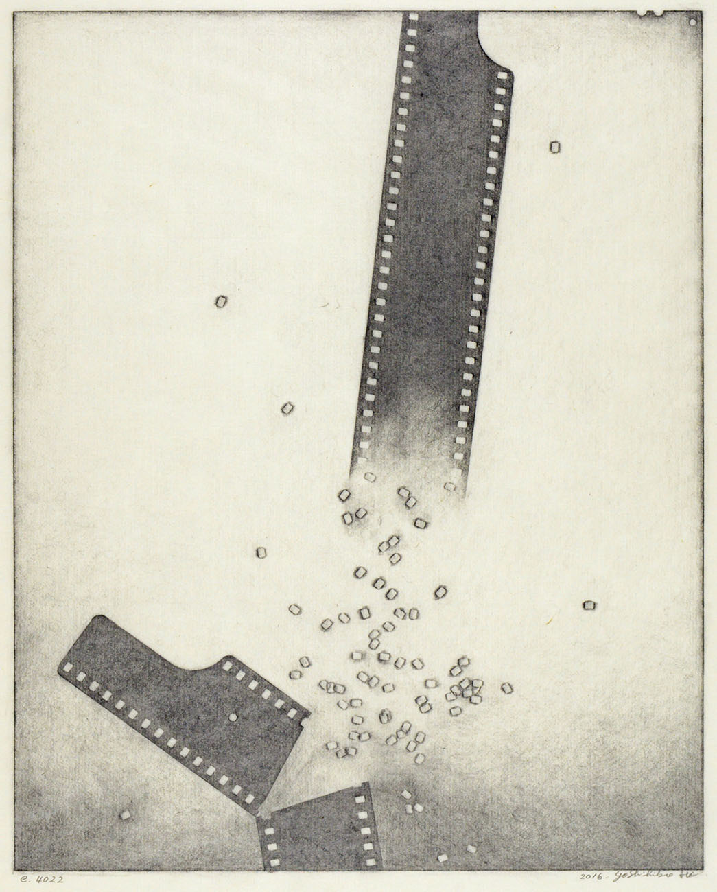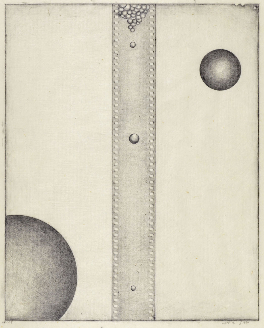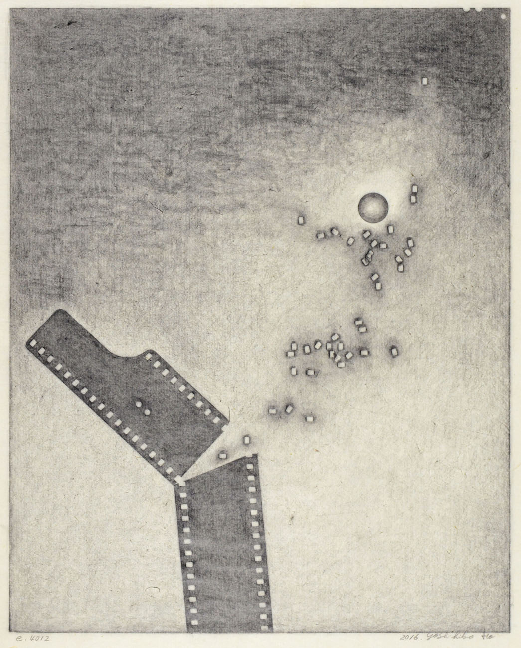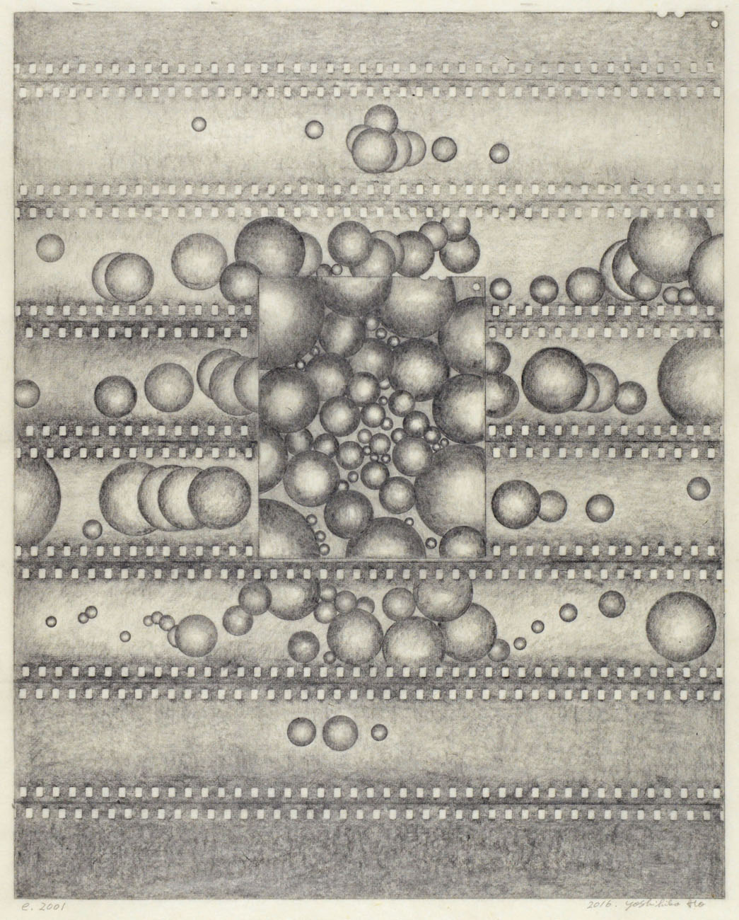 Starting with an outer edge created by rubbing the contours of a 8×10 inch sheet film onto paper, Ito adds layers upon layers of motifs traced off the physical forms of 35mm film, and by doing so creates unusual visions within the larger frame, while perforations of film, hourglass shapes, circular motifs, and spherical objects animate the picture space.