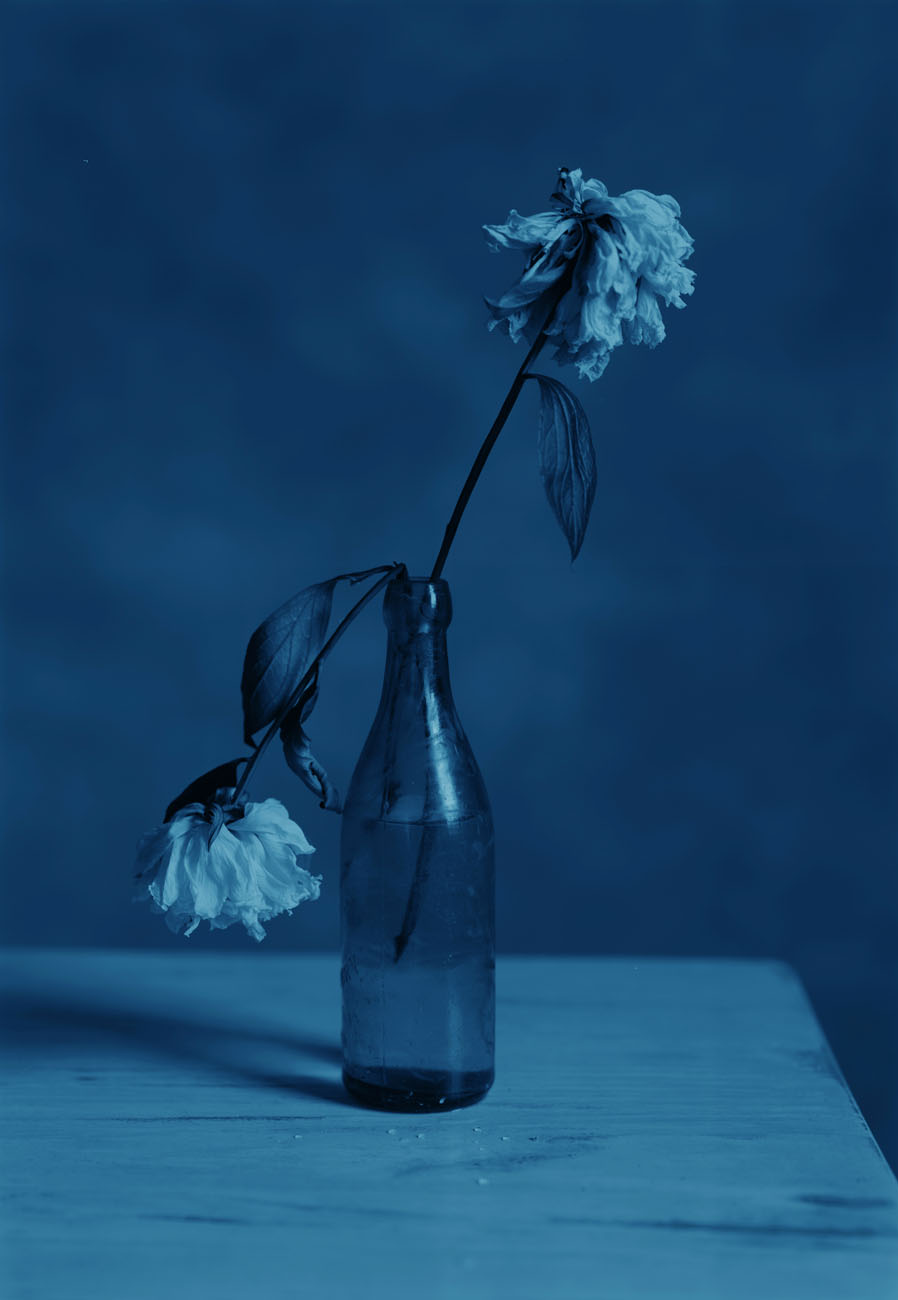 The works featured in PGI’s exhibition of Blue were originally shot in a studio in New York rather than at a sacred site. Body pursues presence through the gestures of a butoh dancer, and Still Life explores the beauty of still life motifs and wilting flowers. Both series owe their mesmerizing quality to the depth and beauty of shadows.