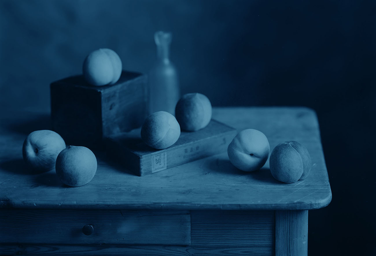 Izu created his Blue series between 2001 and 2004, a deliberate homage to Pablo Picasso’s Blue Period exactly one hundred years earlier. After creating platinum prints from the 14×20-inch negatives, Izu coated them with cyanotype sensitizer and exposed them to ultraviolet light several times. The resulting deep blue color, unique texture and rich detail complement the elegant, serene atmosphere of Izu’s Blue series.