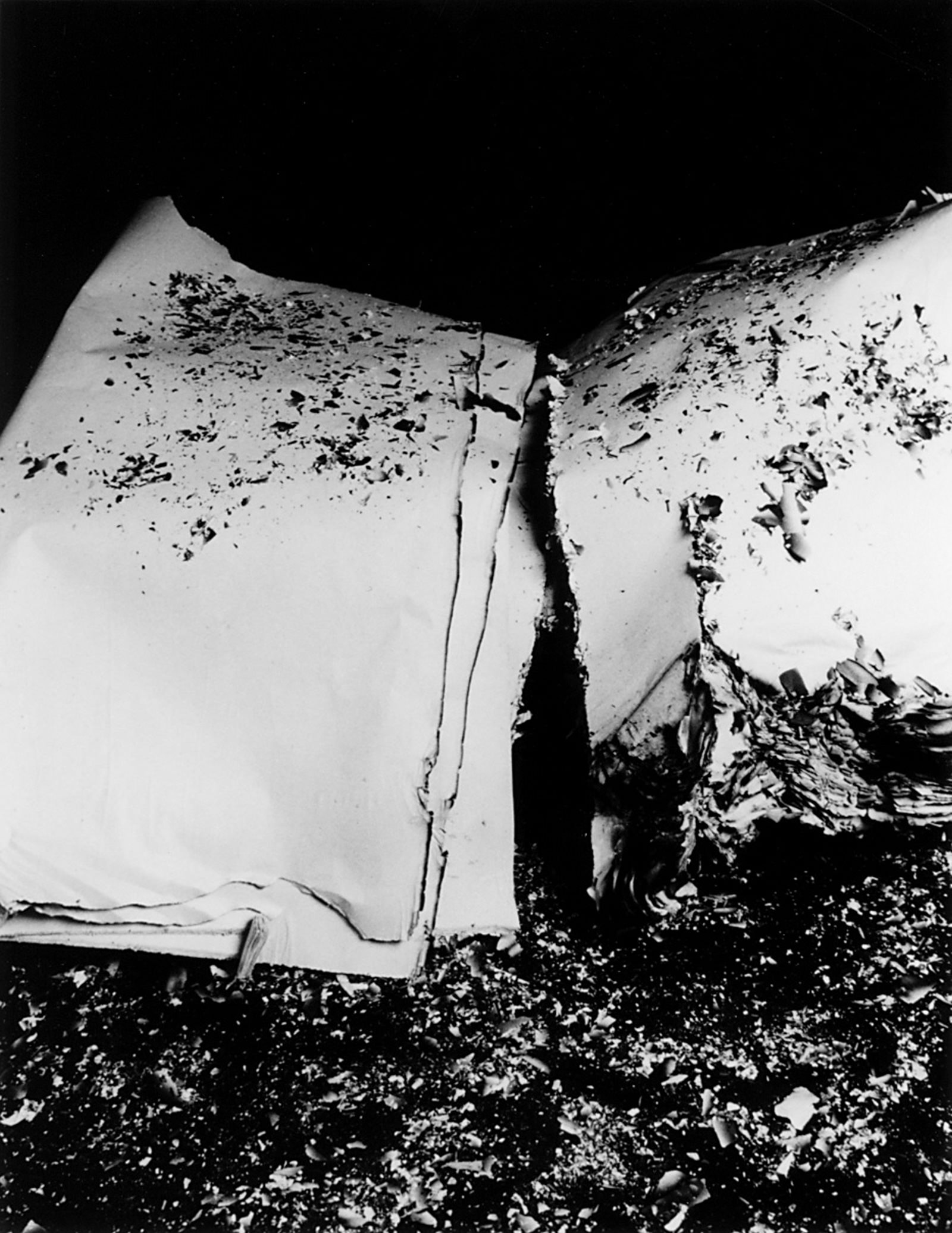 今回発表される新作は、印刷工場の火災により焼け焦げた巨大なロール紙と、阪神大震災で倒壊した神戸の街の、2つの対象を撮影した作品で構成されています。2つの被写体は共に、予期せぬ外部からの巨大な力によって破壊されたものであり、普後はそれらのディティールを大型カメラで克明に記録しています。