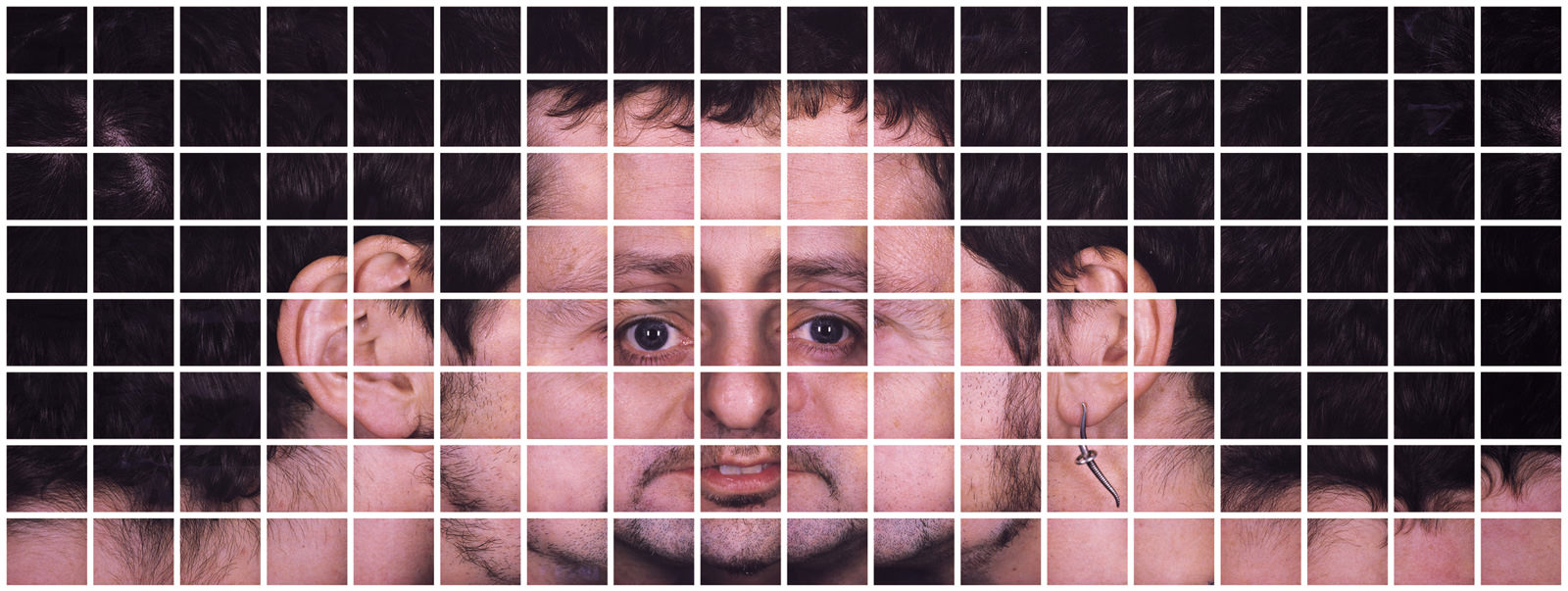 今回フォト・ギャラリー・インターナショナルで展示される「FACES II」の作品は、人の頭部を顔から後頭部に至るまで、上下左右144カットに分割して撮影したクローズアップを、平面に展開し構成した作品です。写真一枚一枚が全体の中の部分として機能し、それぞれの部分写真は再び組み合わされています。このようにして制作された映像は、被写体自身がこれまで意識すらしなかった自分を写し出しています。カラー作品15余点を展示します。