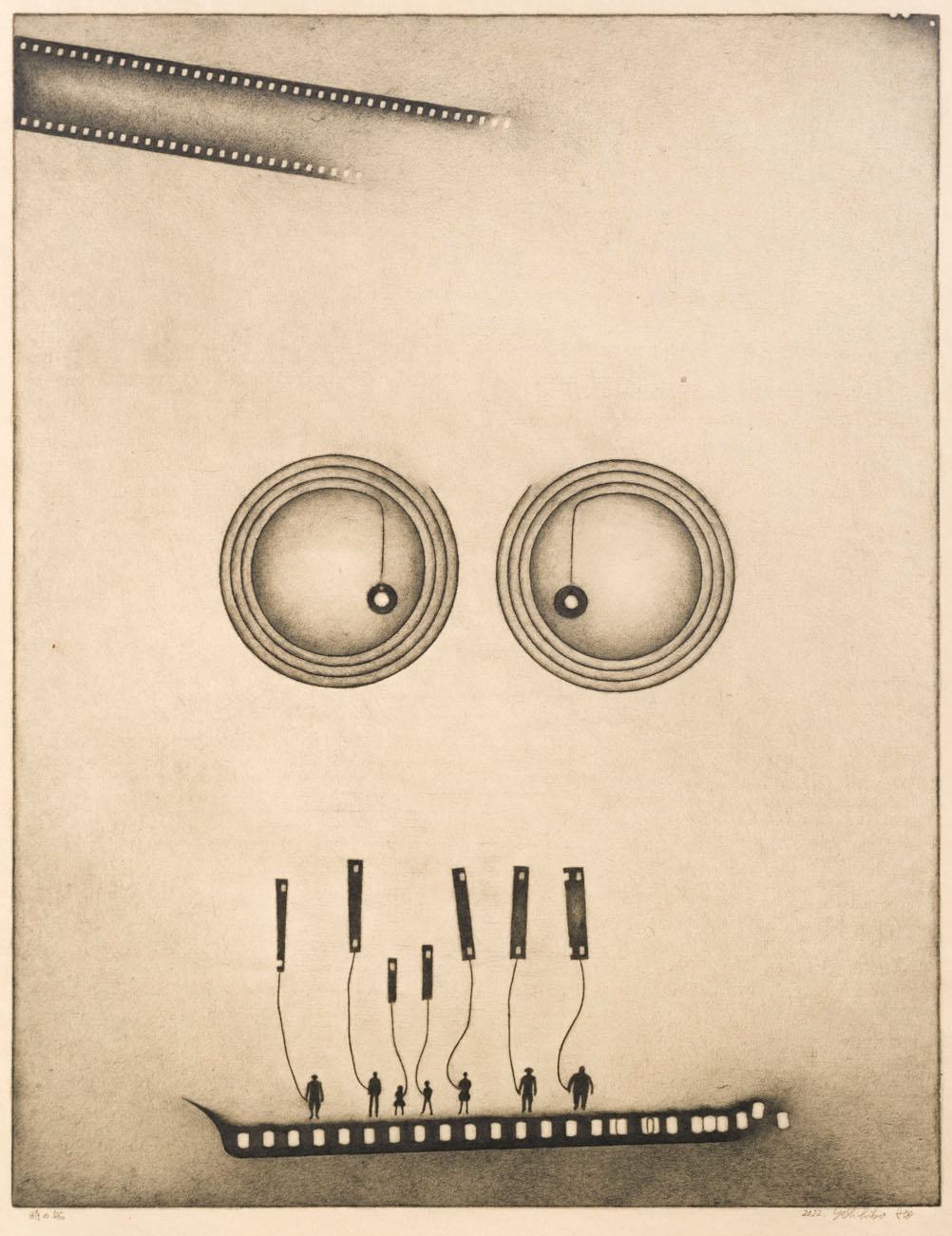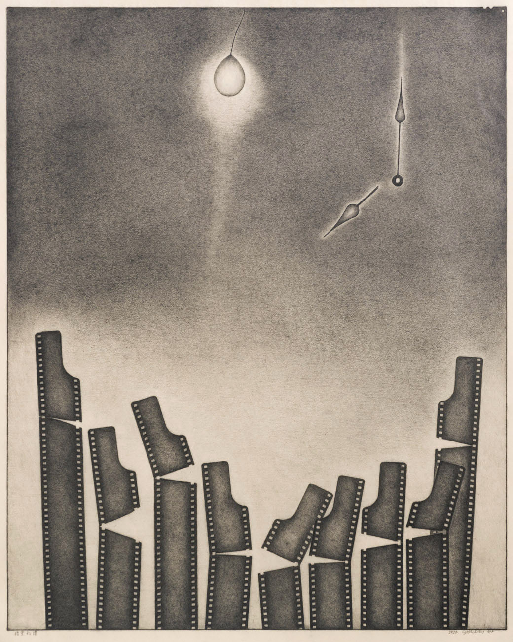 フロッタージュは、凹凸のあるものの上に紙や布を置いて、上から擦ることにより現れる形や模様の偶然性を利用して表現する技法ですが、伊藤のモチーフは主にフィルムであり、そのテクスチャーを利用した表現というより、フィルムから広がった想像の世界を表現した画面構成が特徴と言えるでしょう。