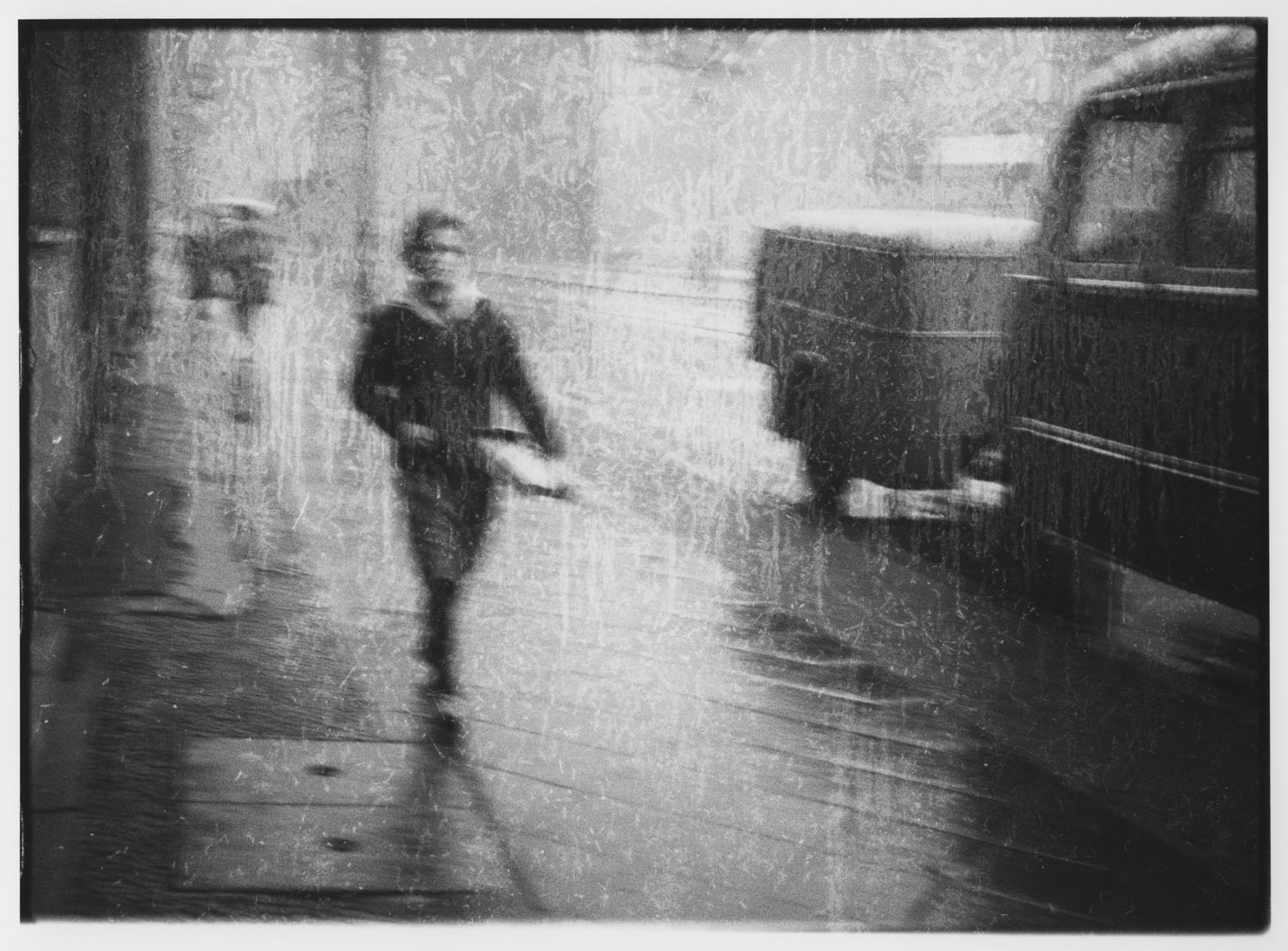 撮影から63年後の2024年、楢橋が選び、制作したプリントには、時代やテクノロジー、国家や個人のアイデンティティの変化など、写真には写らないうつろいを描き出すかのように、美しく粒立つ粒子と、剥離や傷、ビネガーシンドロームの痕跡が描き出されます。まるで抽象絵画と写真の間を泳ぐようなこうしたイメージは、撮影者の楢橋國武も、プリントをする楢橋も想像しなかった景色です。