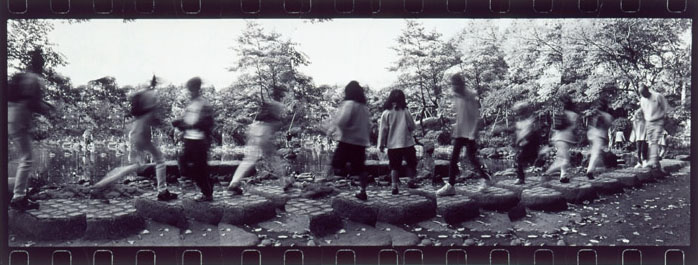 作者は、これまでのようにフィルムの連続した一コマづつを並べて一つの作品を作り上げることから離れ、今度はイメージを継ぎ合わせることに手法を変えています。これらの作品は「写真で作られた絵巻もの」と作者が語るように、時間を凝縮するようにイメージが幾度も重なり合っています。それらはバライタ印画自体の特性を活かした巧妙な貼り付け方によって一枚ものに仕上げられ、記憶の不確かさと写真的な視覚のズレを再認識させてくれるます。初公開のこれらの作品は、従来のコラージュ手法とは異なる、作者独自の写真表現と言えるでしょう。 作品はそれぞれがオリジナルであり、横長のイメージサイズは27×40、18×71、13x105cm等いろいろとあります。