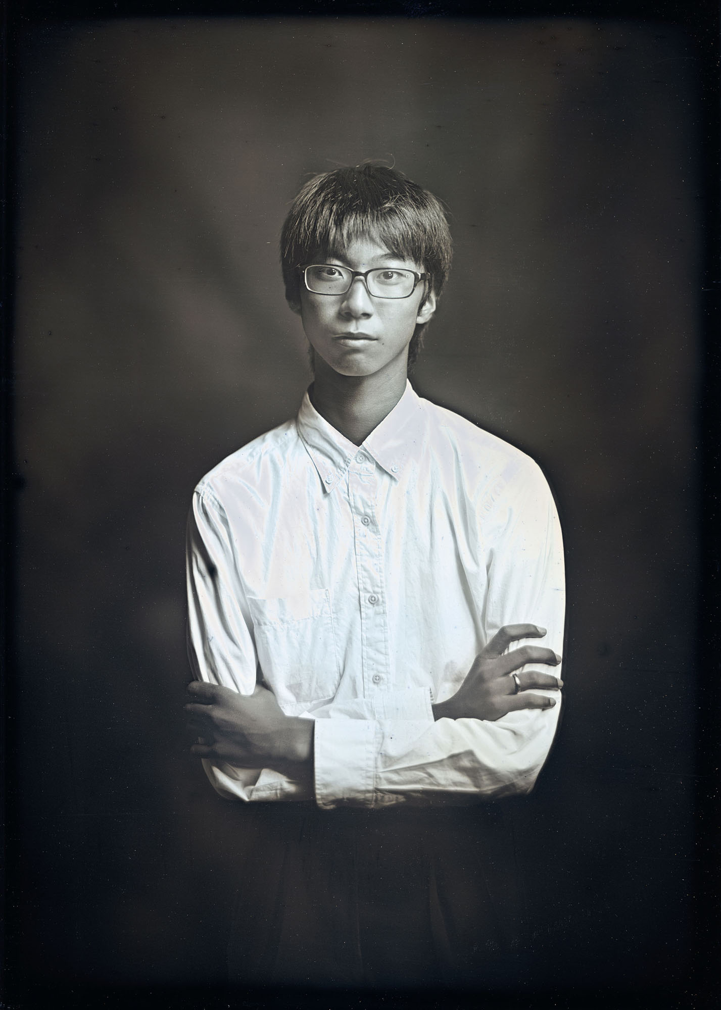 今までわたしが取り組んできた、ダゲレオタイプによるポートレイトは、数秒から時に十数分にわたる長時間露光のため輪郭がすこしぼやけるのが常だったし、むしろそれを好んで作品に採り入れてきた。しかし、今度はそうではなく、こちらを一直線に見つめかえす揺るぎない眼差し──ギュンターの少年の眼差しが、どうしても必要だと直感した。」