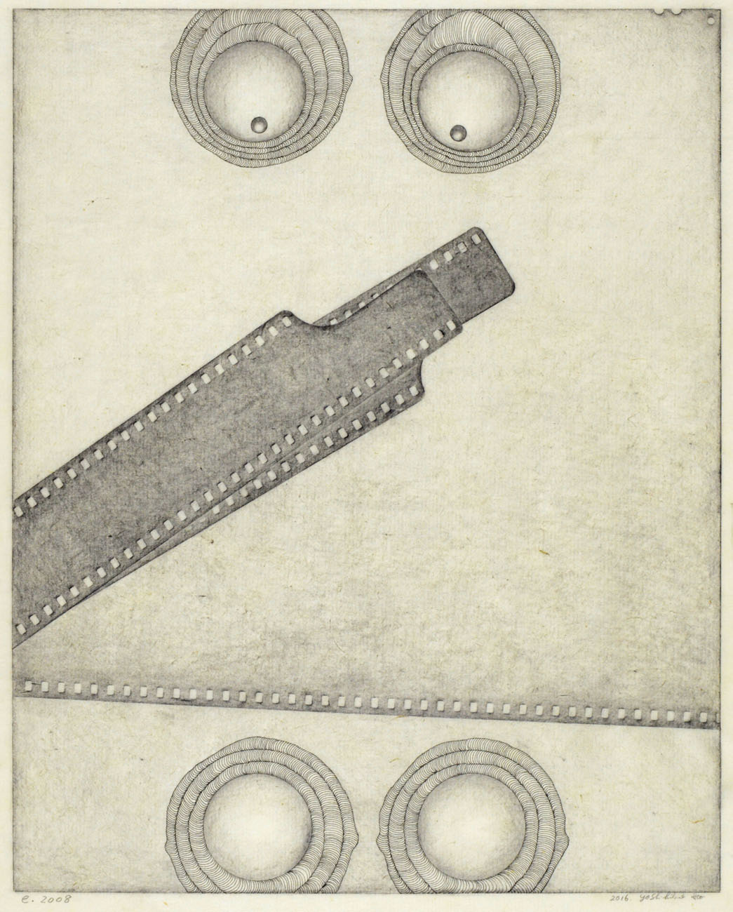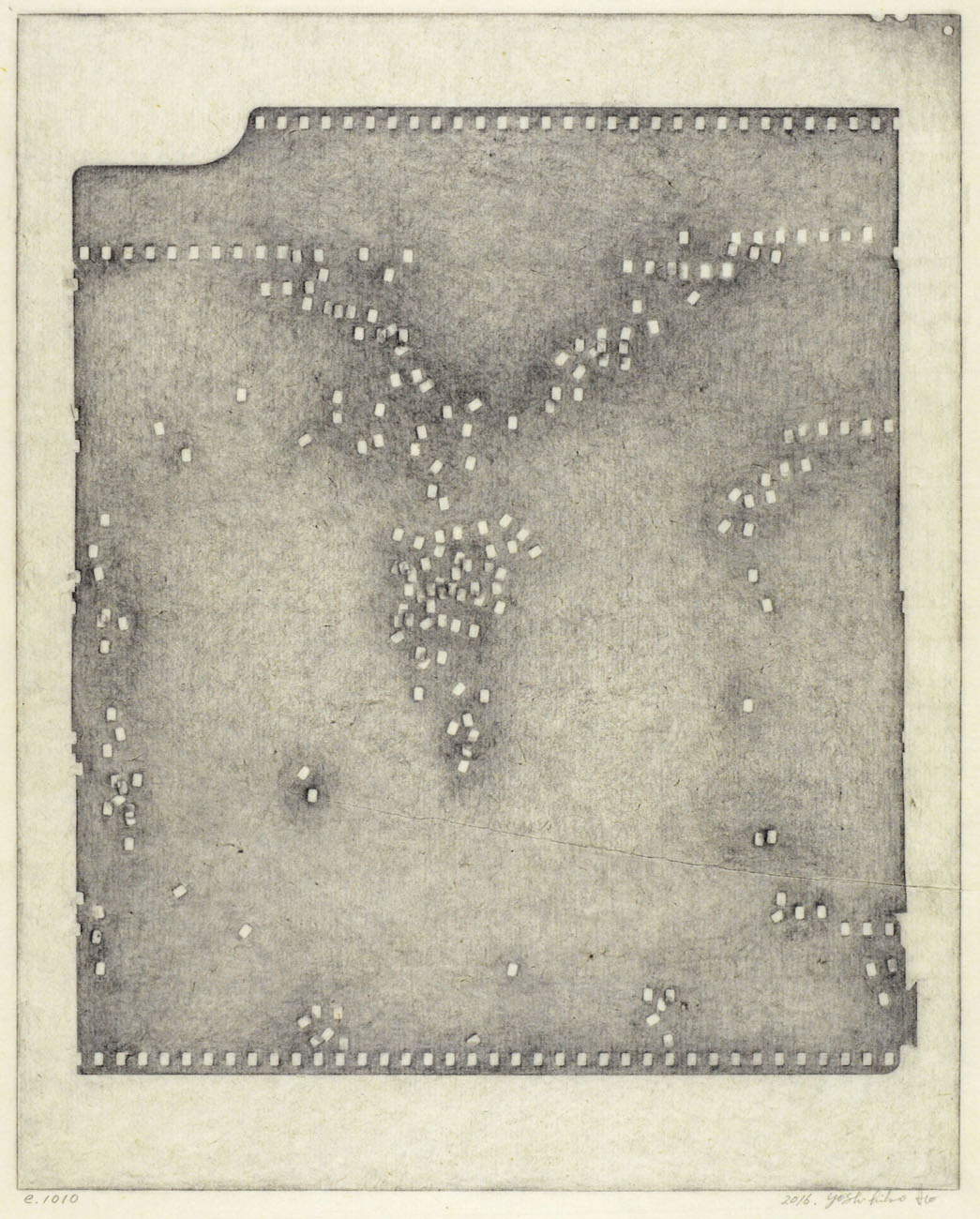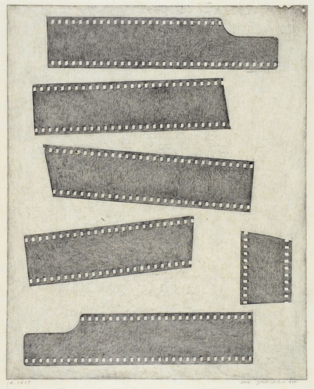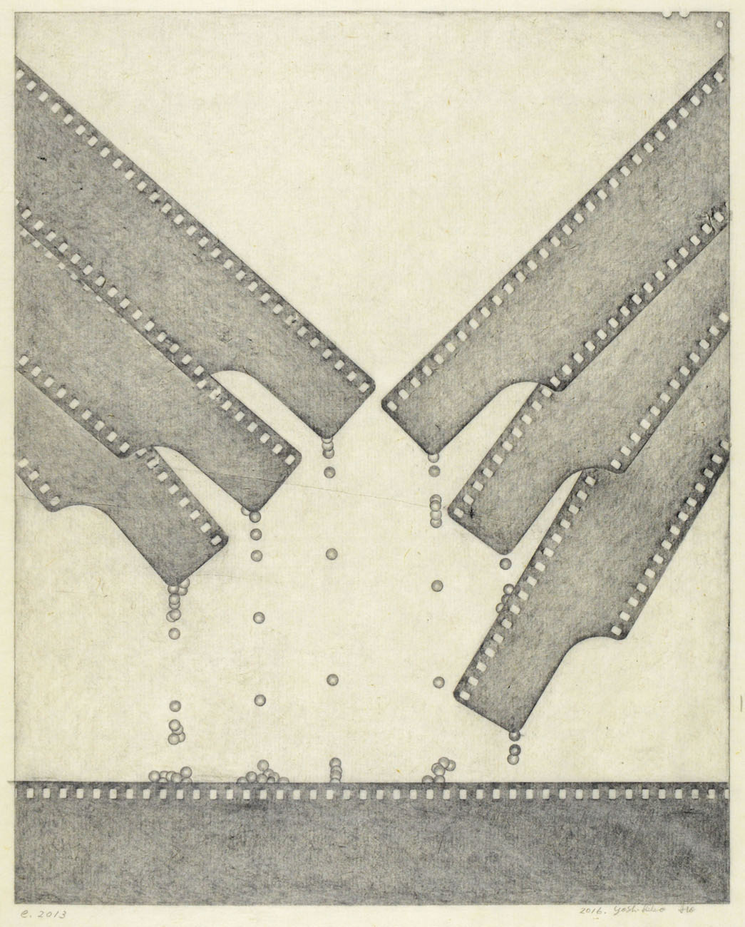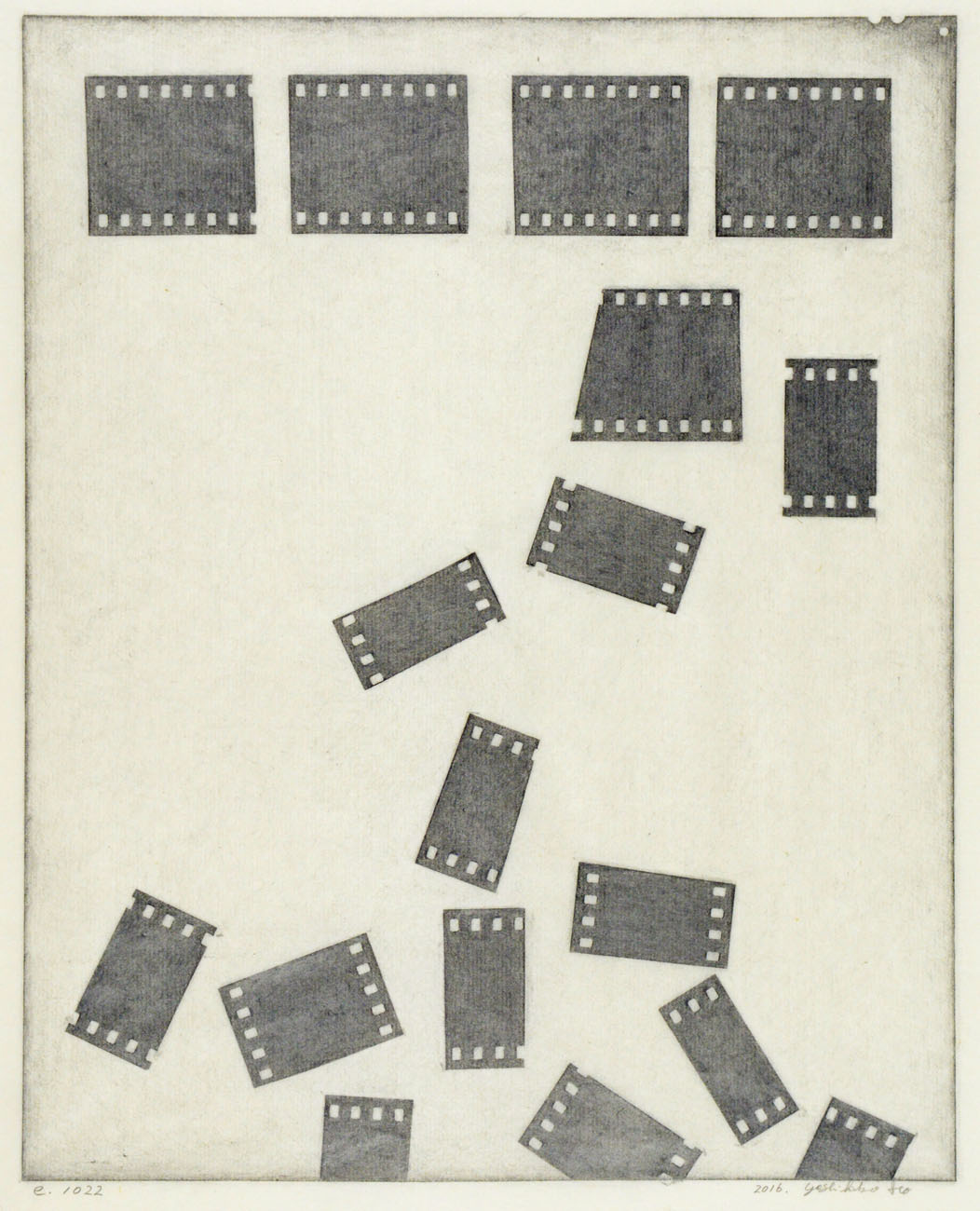フィルム写真を愛用し、暗室作業を好んだ作者は、使うことのなくなったフィルムを日々手に取り、眺めながら、「様々なイメージをかきたてる存在」と語るフィルムから様々なことに思いを巡らせます。そして、写真作品制作時に資料として絵コンテやスケッチに慣れ親しんだことから、この愛着あるフィルムをモチーフにフロッタージュ作品の制作に没頭するようになります。