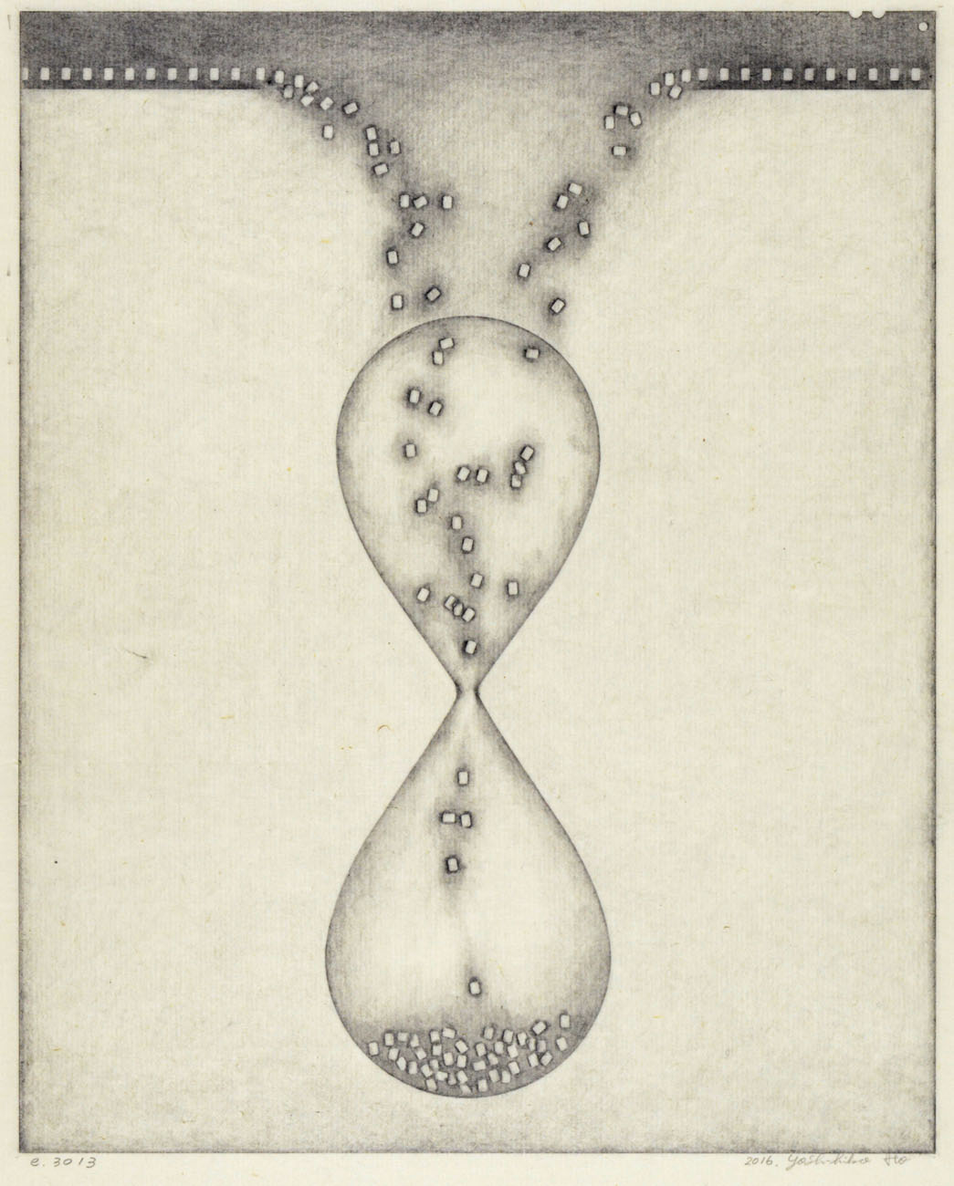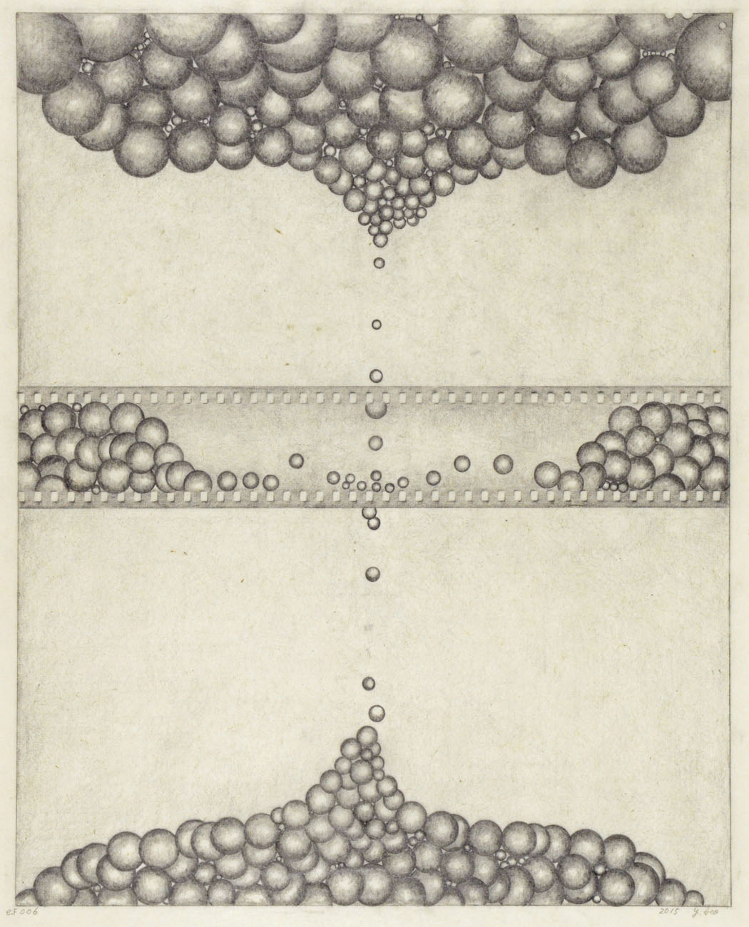 8×10(エイトバイテン)のフィルムをベースに描き、その中に35mmフィルムを用い、様々な世界が展開されます。時間の流れを連想させるフィルムのパーフォレーションや砂時計、円や球体は、伊藤が写真家としてのキャリアの中で常に表現し続けてきた、写真に向き合う思考が表現されています。一枚一枚緻密な手作業によって生み出された作品には、作者にとって想像の源であるフィルムが繰り返し描かれ、フィルムがまるで生き物のように画面の中の世界を謳歌しています。