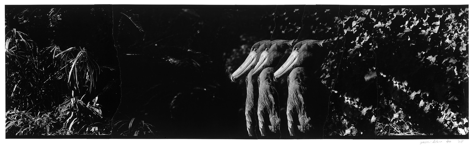 作者は、池の中で泳ぐ鯉や動物園の檻の中でじっと動かないハシビロコウ(注*)、芝生の上を駆け回る子供といった被写体にカメラを向け、プリントを制作する過程で作者自身の時間を再構築します。