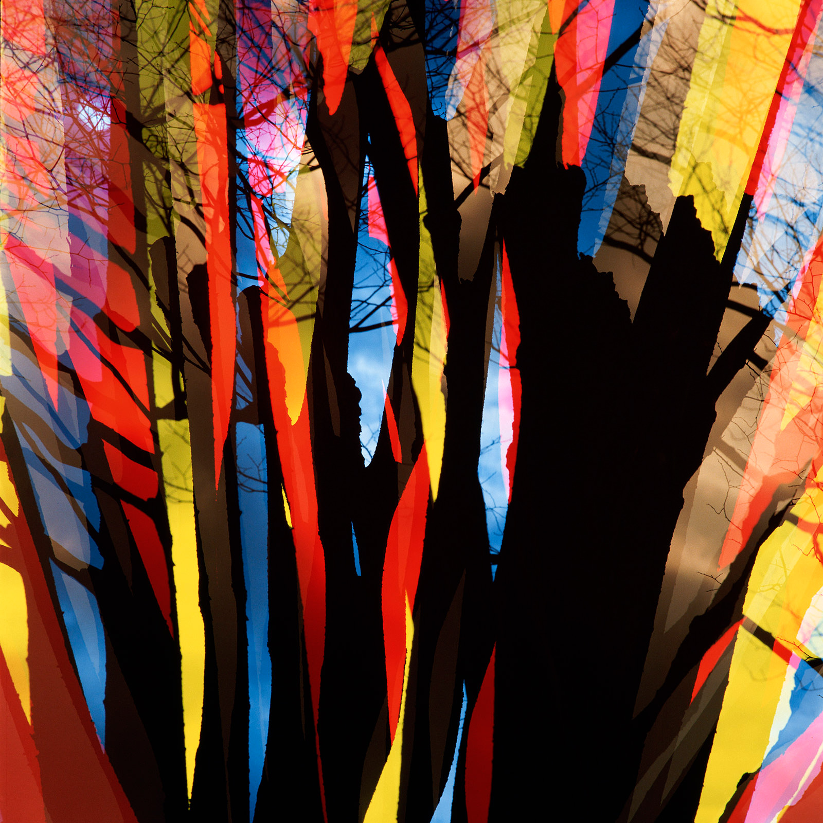 カラーの多重露光の作品は、ロールフィルムを入れた6×6のカメラで葉を落とした樹木や建造物のシルエットを撮影し、そこに色を重ね合わせて作られています。1973年から竹中工務店の季刊PR誌『approach』の表紙を飾ってきました。いくつかのポジからプリント上に合成した画像ではなく、 フィルムのひとつのコマに何度か露光することで、作者も思いも寄らない色とかたちが浮かび上がってきます。「暗室で操作して作り出すのとは違い、多分に偶然が作用するが、そこが写真の面白さだと思っている。」と氏は語ります。あくまでも写真にこだわりながらも、出来上がった作品は写真の世界を超えて、モダ ンアートの極みとなっています。天からの贈り物のような色鮮やかな、まばゆいばかりの色とかたち。偶然ともいえる出会いが、石元氏の遊び心をも反映してい ます。これらの作品は、「調和のとれた美」の作品を世に生み出してきた石元氏の、他に類を見ないきわめてユニークな作品といえるでしょう。