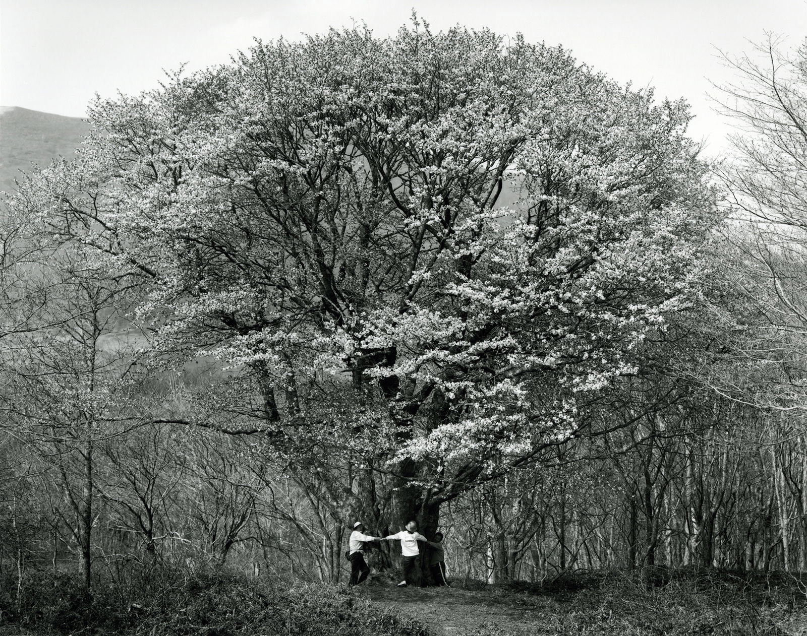 桜の撮影は1998年から始まりました。毎年春になると「さくら前線」と共に北上する旅を繰り返す作者は、各地の桜を訪ね、気に入った桜だけを写してきました。人々の心を虜にし、「花見」でたくさんの人を集める桜があり、そして、風景の中にたたずむ桜があります。風物としての桜を撮るうちに、しだい に桜そのものを撮るようになった作者は、再び「桜」と向き合っています。「朝、誰もいない桜の下で目覚めた時に、そこに咲いている桜を覧て、その時感じた 気持や状態と対等に向き合って撮影している」と、作者は語っています。