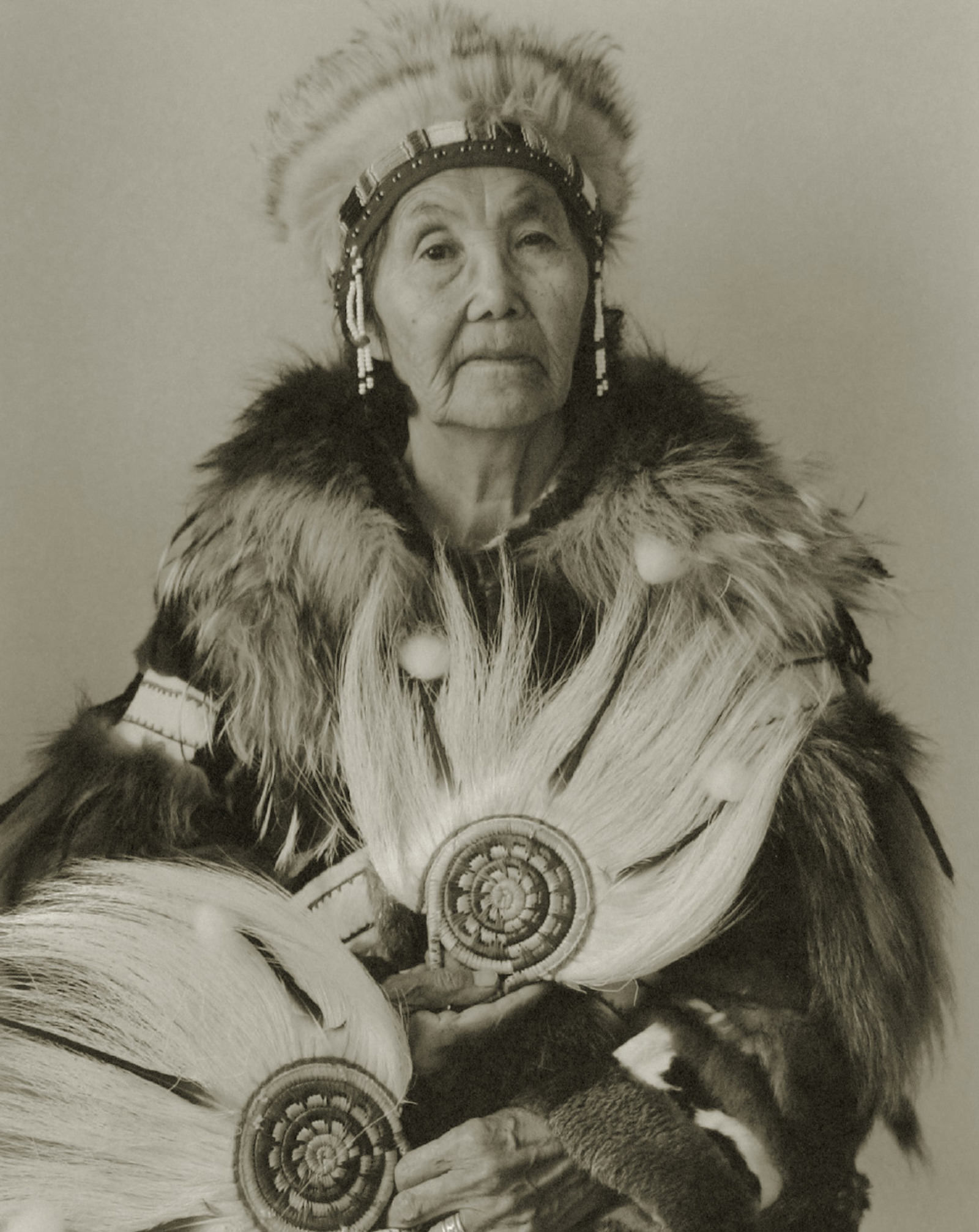 伝統的な暮らしが営まれていた時代に生まれ育った最後の語り部でもある老人たちと、伝統と西洋文化のはざまで生まれ育ち、苦しみながらも自らのアイデンティティーを模索する若い世代をひとつの画面に納めることができるのは、今しかないであろう。この視点から、一九九四年以降アラスカのエスキモーとアリュートの村々を訪ねて、親子三世代以上をふくむ極北の家族を8X10インチの大型カメラで撮影する旅を続けてきた。また、この撮影テーマにおいて、厳しい極北の自然に適応した彼ら独自の文化、狩猟道具や伝統工芸品、そして自然風景も重要なモチーフとなっており、これらの作品を含めて豊かな階調と優れた保存性をあわせ持つプラチナ・パラジウムプリントで製作した。