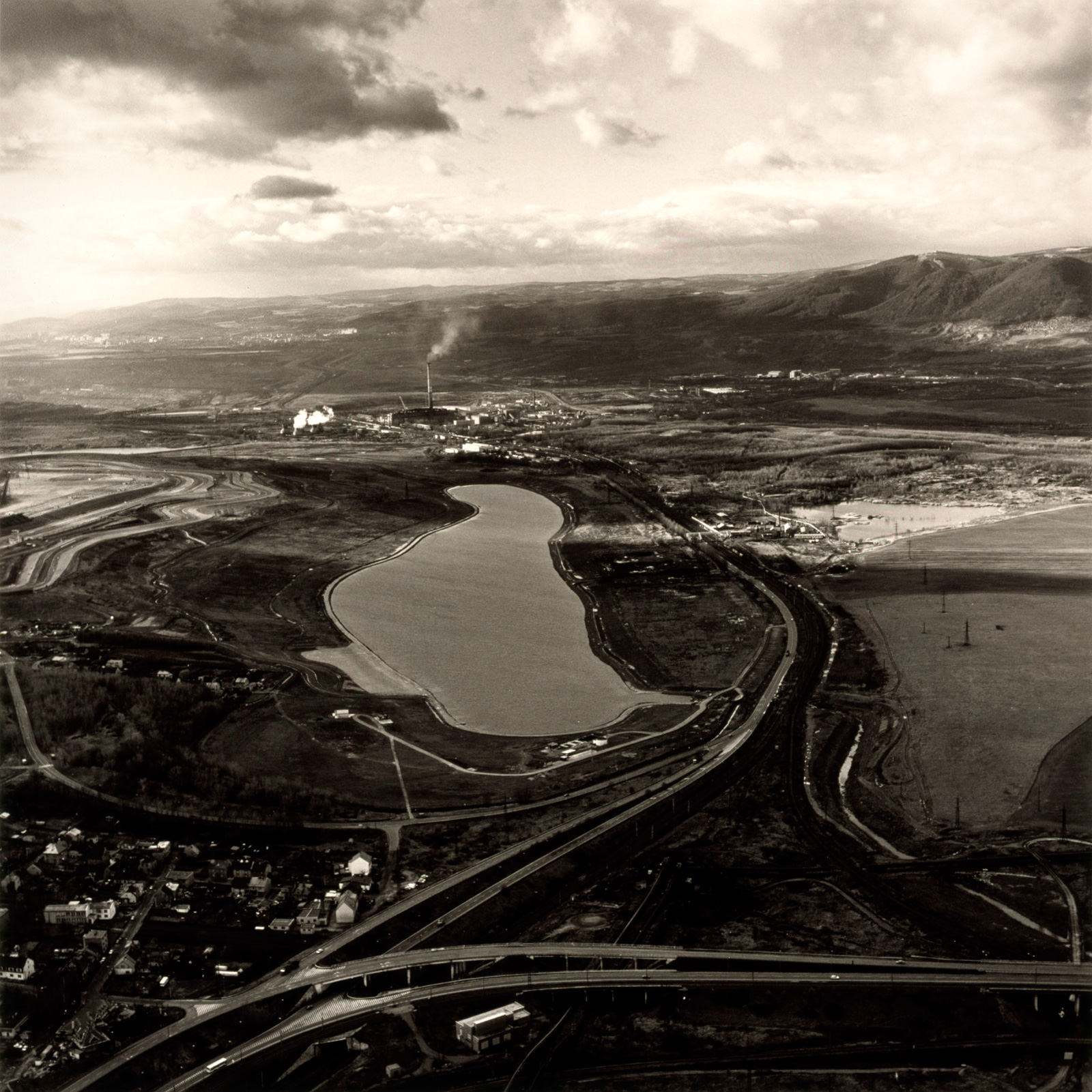 1992年の春に初めてチェコ共和国を訪れたエメット・ゴーウィンは、空から大地を撮影しました。そこに広がるのは、青灰色の煙をたなびかせる発電所や、石炭の露天掘り鉱山、小さな村が潰されて建てられた高層アパートなど、そこに住む人々の不安をよそに大きく姿を変えてい くチェコの大地でした。しかし同時に、その光景は息をのむほど美しいものでした。「その日は今までにないほどの、とても美しい春の日でした。暗く、そして 光り輝く、風の強い三月の空が、花をつけた桜の若木と巨大な冷却タワーとの間にコントラストを付けていました。厚い雲を鋭くさすような一筋の光や、一片の 空間が開かれていく様子が、今でも信じがたいほど懐かしく思い出されます。」
