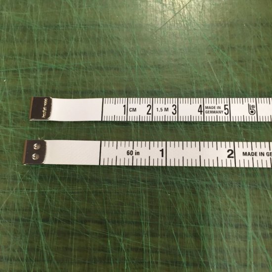 両面にインチとセンチメートルが刻まれたメジャーです。引き出す時は5cm毎にストッパーが作動し、ワンプッシュで巻き戻ります。始まりに3cmの余白があるのでプリントでも危険が少ない。テープ幅10mm、ポリファイバー製。ケース部ABS樹脂。